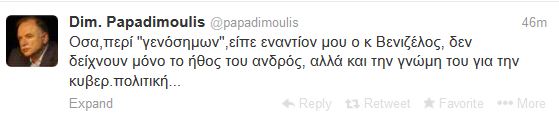 “Όσα,περί “γενόσημων”,είπε εναντίον μου ο κ Βενιζέλος, δεν δείχνουν μόνο το ήθος του ανδρός, αλλά και την γνώμη του για την κυβερνητική πολιτική…”
