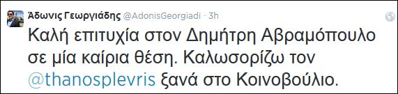 Ο Άδωνις Γεωργιάδης δεν έκρυψε τη χαρά του όπως φάνηκε και από το ακόλουθο σχόλιο στο Twitter: «Καλή επιτυχία στον Δημήτρη Αβραμόπουλο σε μία καίρια θέση. Καλωσορίζω τον @thanosplevris ξανά στο Κοινοβούλιο».