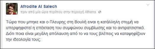 Από την άλλη η Αφροδίτη Αλ Σάλεχ έγραψε στο Facebook: «Τώρα που μπήκε και ο Πλεύρης στη Βουλή είναι η κατάλληλη στιγμή να υπερψηφιστεί η επέκταση του συμφώνου συμβίωσης και το αντιρατσιστικό. Διότι ποια είναι μεγάλη απόλαυση από το να τους βλέπεις να καταψηφίζουν την ιδεολογία τους»;