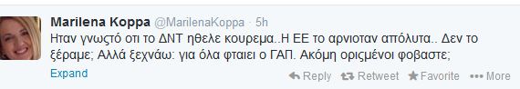 «Ηταν γνωςτό οτι το ΔΝΤ ηθελε κουρεμα..Η ΕΕ το αρνιοταν απόλυτα.. Δεν το ξέραμε; Αλλά ξεχνάω: για όλα φταιει ο ΓΑΠ. Ακόμη οριςμένοι φοβαστε;», ήταν το σχόλιο της κ. Κοππά.