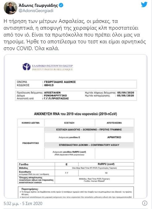 «Η τήρηση των μέτρων Ασφαλείας, οι μάσκες, τα αντισηπτικά, η αποφυγή της χειραψίας κλπ προστατεύει από τον ιό. Είναι τα πρωτόκολλα που πρέπει όλοι μας να τηρούμε. Ήρθε το αποτέλεσμα του τεστ και είμαι αρνητικός στον COVID. Όλα καλά», ανέφερε χαρακτηριστικά ο κ. Γεωργιάδης.