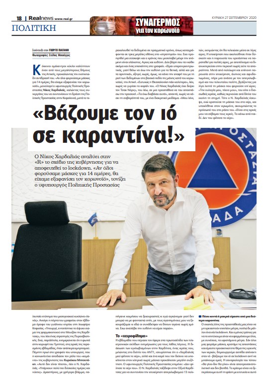 Κόκκινοι ομόκεντροι κύκλοι καλύπτουν έναν από τους μεγαλύτερους δήμους της Αττικής προκαλώντας την ενστικτώδη αντίδραση του. «Αν όλοι φορούσαμε μάσκες για 14 ημέρες θα είχαμε εξαφανίσει τον κορονοϊό», μονολογεί καλώντας τους συνεργάτες του να συντονίσουν τη δράση της Πολιτικής Προστασίας στην Κεφαλονιά, μετά το τελευταίο χτύπημα του Μεσογειακού κυκλώνα «Ιανού». Ανοίγει η πόρτα του γραφείου στον έβδομο όροφο του γυάλινου κτιρίου στη Λεωφόρο Κηφισίας. «Υπουργέ εντοπίστηκε το άψυχο σώμα της φαρμακοποιού στο Μουζάκι της Καρδίτσας» του αναφέρει ένας στρατηγός της Πυροσβεστικής. Ενώ παράλληλα ενημερώνεται ότι η φωτιά στην κορυφή του Υμηττού στις αρχές της περασμένης εβδομάδας, ήταν απόπειρα εμπρησμού. Πέμπτη πρωί στο γραφείο του υπουργού που η κοινωνία έχει αποδώσει τον ρόλο του «κομάντο» της κυβέρνησης του Κυριάκου Μητσοτάκη. «Αυτό δεν είναι τίποτα» λέει ο Νίκος Χαρδαλιάς.