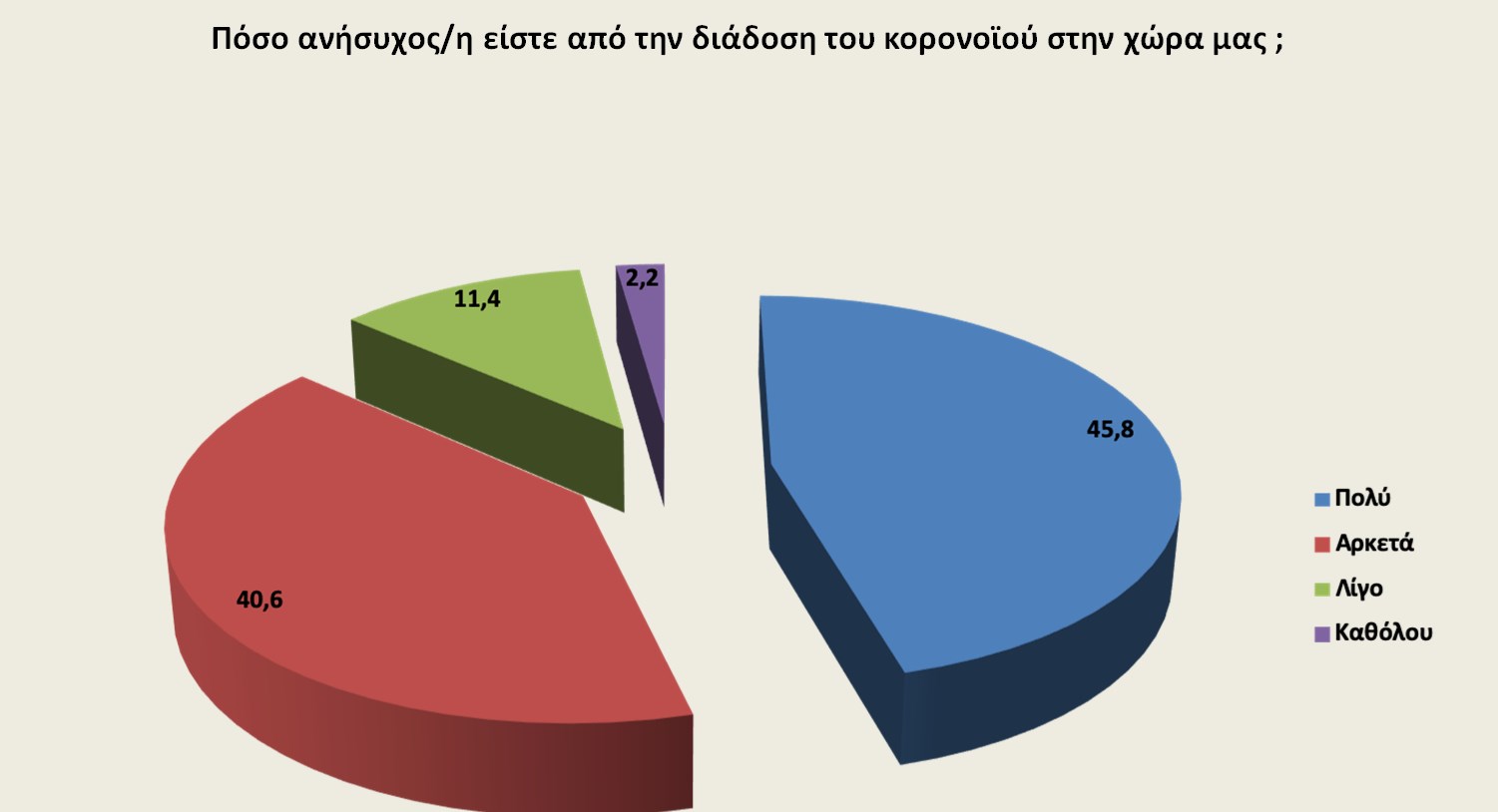 Συγκεκριμένα, το 85% των πολιτών, σύμφωνα με το μηνιαίο βαρόμετρο της Opinion Poll είναι ικανοποιημένο από τις αποφάσεις και τις ενέργειες του Πρωθυπουργού Κυριάκου Μητσοτάκη για την αντιμετώπιση της πανδημίας. Ενώ η συντριπτική πλειοψηφία, με 86,4% των Ελλήνων ανησυχεί για τον κορονοϊό. Η έρευνα λόγω των περιοριστικών μέτρων της κυβέρνησης, έγινε με το μοντέλο της απομακρυσμένης εργασίας με την λειτουργία της ειδικής πλατφόρμας CloudCallCenter. Η έρευνα πραγματοποιήθηκε σε συνολικά 1.095 νοικοκυριά το χρονικά διάστημα 23 Μαρτίου με 26 Μαρτίου 2020.
