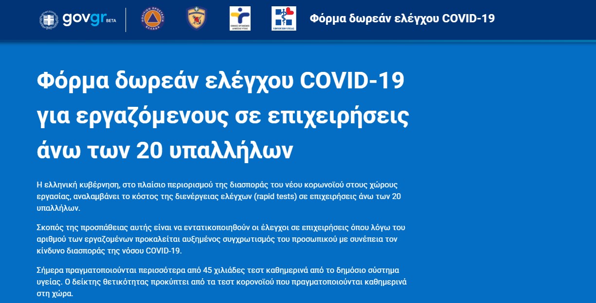 Σε κάθε περίπτωση, υπενθυμίζεται ότι για όσους εργαζομένους απασχολούνται σε εταιρείες με λιγότερους από 20 υπαλλήλους, υπάρχει η δυνατότητα εγγραφής στην πλατφόρμα testing.gov.gr.