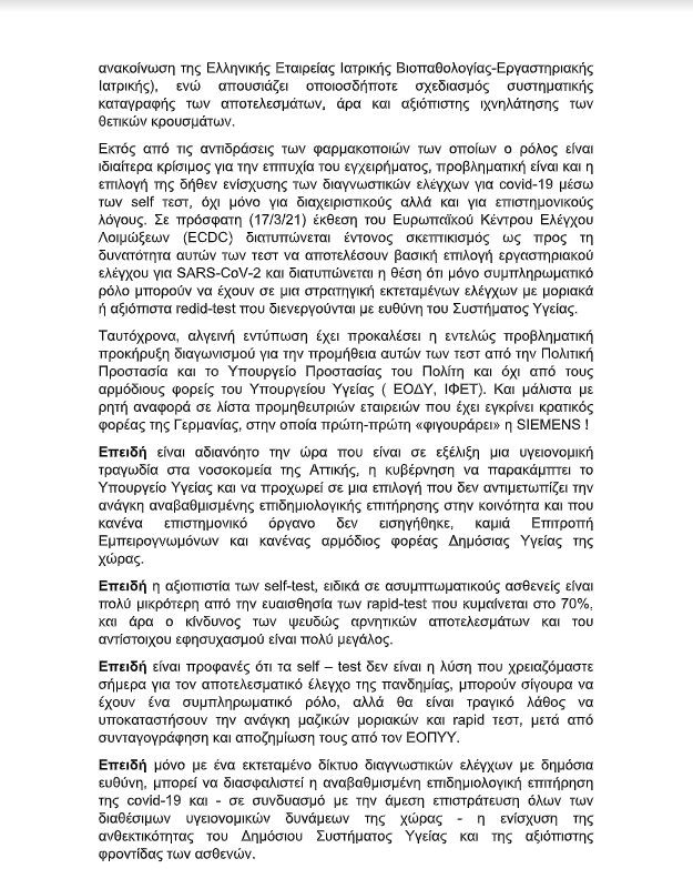 Επειδή είναι προφανές ότι τα self – test δεν είναι η λύση που χρειαζόμαστε σήμερα για τον αποτελεσματικό έλεγχο της πανδημίας, μπορούν σίγουρα να έχουν ένα συμπληρωματικό ρόλο, αλλά θα είναι τραγικό λάθος να υποκαταστήσουν την ανάγκη μαζικών μοριακών και rapid τεστ, μετά από συνταγογράφηση και αποζημίωση τους από τον ΕΟΠΥΥ.