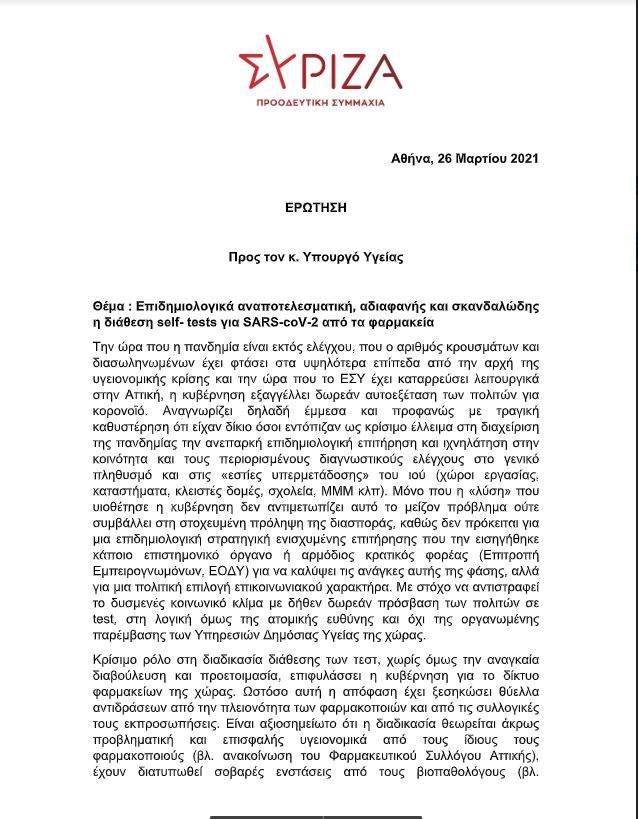 “Την ώρα που η πανδημία είναι εκτός ελέγχου, που ο αριθμός κρουσμάτων και διασωληνωμένων έχει φτάσει στα υψηλότερα επίπεδα από την αρχή της υγειονομικής κρίσης και την ώρα που το ΕΣΥ έχει καταρρεύσει λειτουργικά στην Αττική, η κυβέρνηση εξαγγέλλει δωρεάν αυτοεξέταση των πολιτών για κορονοϊό. Αναγνωρίζει δηλαδή έμμεσα και προφανώς με τραγικήκαθυστέρηση ότι είχαν δίκιο όσοι εντόπιζαν ως κρίσιμο έλλειμα στη διαχείριση της πανδημίας την ανεπαρκή επιδημιολογική επιτήρηση και ιχνηλάτηση στην κοινότητα και τους περιορισμένους διαγνωστικούς ελέγχους στο γενικό πληθυσμό και στις «εστίες υπερμετάδοσης» του ιού (χώροι εργασίας,καταστήματα, κλειστές δομές, σχολεία, ΜΜΜ κλπ).