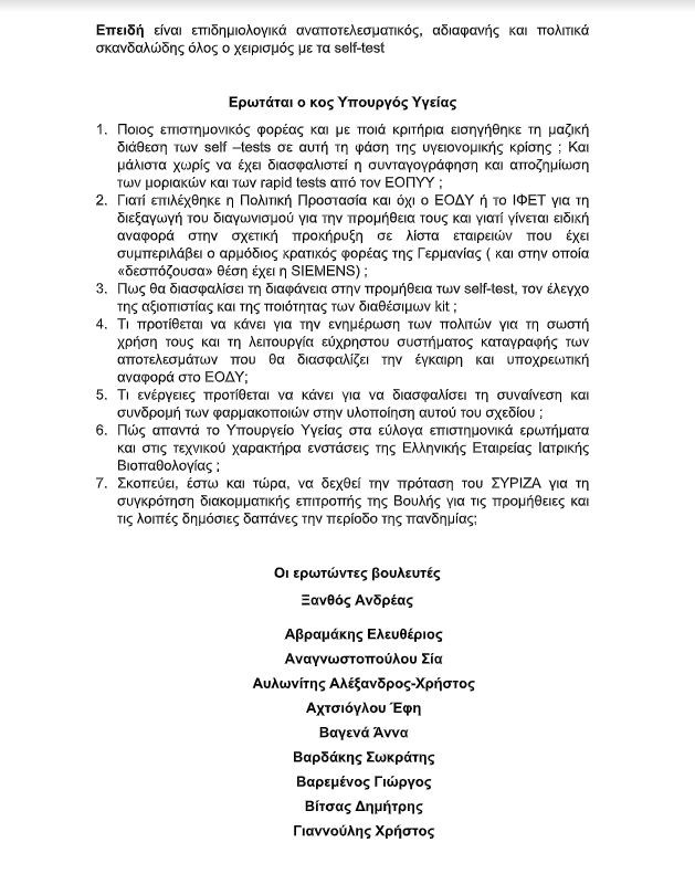 Όπως αναφέρεται στην ανακοίνωση, “οι βουλευτές του ΣΥΡΙΖΑ θέτουν μία σειρά από σημαντικά ερωτήματα για την επιστημονική τεκμηρίωση και επιδημιολογική αξιοπιστία της συγκεκριμένης διαγνωστικής μεθόδου, τη διαφάνεια της διαγωνιστικής διαδικασίας και την πιθανότητα να ευνοηθούν συγκεκριμένα επιχειρηματικά συμφέροντα, τη διασφάλιση της συναίνεσης των φαρμακοποιών καθώς και την πρόταση της αξιωματικής αντιπολίτευσης για συγκρότηση διακομματικής επιτροπής της Βουλής για τις προμήθειες και τις λοιπές δημόσιες δαπάνες την περίοδο της πανδημίας”.Αναλυτικά, το περιεχόμενο της ερώτησης, έχει ως εξής: