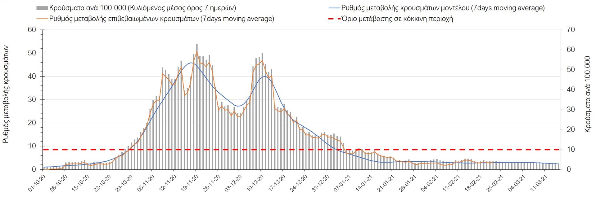 Συμπεράσματα:Η αύξηση που παρατηρείται πλέον στον αριθμό των ασθενών σε κρίσιμη κατάσταση (διασωληνομένοι σε ΜΕΘ), καθώς και ο αριθμός των θανάτων συνάδουν με τις προσομοιώσεις του μοντέλου CORE για τον επόμενο μήνα, ενώ και ο αριθμός των νέων κρουσμάτων παραμένει ανησυχητικός, ιδιαίτερα για την Αττική. Τα παραπάνω αποτελέσματα αποτυπώνονται και στο δείκτη θετικότητας. Σε πανελλαδικό επίπεδο ο κυλιόμενος εβδομαδιαίος μέσος όρος του δείκτη θετικότητας παρέμεινε σταθερός στο 3,6% (η ημερήσια τιμή είναι 5,6%) ενώ ο κυλιόμενος εβδομαδιαίος μέσος όρος του πραγματικού αριθμού αναπαραγωγής Rt (δηλαδή ο αριθμός των ατόμων που ένας φορέας μπορεί να επιμολύνει) είναι πλέον 1,02 (τιμές του Rt πάνω από τη μονάδα υποδηλώνουν καθαρή αύξηση της διασποράς του ιού στην κοινότητα). Παρατηρείται δηλαδή εδώ και λίγες ημέρες μια σταθεροποίηση της διασποράς του SARS-CoV-2 στη χώρα. Mε βάση τα δεδομένα αυτής της εβδομάδας, καλώς εφαρμόσθηκαν τα περιοριστικά μέτρα που ισχύουν από τις 6 Φεβρουαρίου, τα οποία ίσως χρειαστούν επιπλέον αναθεώρηση, με βάση την επιδημιολογική εικόνα που θα επικρατήσει, ενώ επίσης καλώς εφαρμόσθηκε το lockdown μέχρι τις 28 Φεβρουαρίου στην Αθήνα. Με τα μέχρι τώρα δεδομένα, τα μέτρα αυτά φαίνονται να είναι ικανά να αναχαιτίσουν προσωρινά την επέλαση ενός τρίτου κύματος, εν αναμονή και επιπλέον στοιχείων, τόσο για τη μεταδοτικότητα του στελέχους B.1.1.7. του SARS-CoV-2, όσο και της διασποράς του στην κοινότητα.Παρά την εφαρμογή οριζόντιων μέτρων ανάσχεσης της πανδημίας που εφαρμόσθηκαν από τα τέλη Οκτωβρίου, η πορεία της τελευταίας διαφοροποιείται από περιοχή σε περιοχή. Οι παραπάνω παρατηρήσεις τείνουν στο συμπέρασμα ότι η διαχείριση του υγειονομικού κινδύνου θα πρέπει να εξεταστεί σε τοπικό επίπεδο. Πλέον προβληματίζουν πέρα από την Αττική, η Αχαΐα, η Εύβοια, η Θάσος, η Χαλκιδική, καθώς επίσης η Αρκαδία, η Αργολίδα, το Ρέθυμνο και το Ηράκλειο. Ιδιαίτερη προσοχή χρειάζεται και η Θεσσαλονίκη, στην οποία προβλέπεται αύξηση του ιικού φορτίου του SARS-CoV-2 στην κοινότητα και αύξηση κρουσμάτων τις επόμενες ημέρες.Συνολικά, τα τεστ ανίχνευσης θα πρέπει να διπλασιαστούν τουλάχιστον και να δίνεται έμφαση στοχευμένα στις περιφερειακές ενότητες στις οποίες η δυναμική της διασποράς φαίνεται να είναι ανησυχητική για 1-2 ημέρες ώστε να ανιχνεύονται οι ασυμπτωματικοί και προσυμπτωματικοί φορείς και να σπάει η αλυσίδα μετάδοσης βάζοντάς τους σε καραντίνα. Λόγω της ανησυχίας που εγείρει η παρουσία στην κοινότητα των μεταλλαγμένων στελέχους του SARS-CoV-2 (κυρίως η βρετανική και η νοτιοαφρικανική μετάλλαξη) και προκειμένου να περιορίσουμε ή τουλάχιστον να καθυστερήσουμε την ευρεία διασπορά τους, προτείνουμε τα ακόλουθα μέτρα πριν συζητηθεί το περαιτέρω άνοιγμα εκπαιδευτικών και οικονομικών δραστηριοτήτων:– εφαρμογή του ήδη υπάρχοντος νομοθετικού πλαισίου για την τηλεργασία (όσο το δυνατόν περισσότερο, αλλά τουλάχιστον 50%) ή ακόμη και αύξηση του ελάχιστου ορίου τηλεργασίας στο 70% όπου αυτό είναι δυνατόν τόσο από δημόσιους όσο και ιδιωτικούς φορείς – είναι απαραίτητο να υπάρξει άμεσα πολύ μεγαλύτερος έλεγχος της εφαρμογής της σχετικής ΚΥΑ από όλους τους εργοδότες του ιδιωτικού και δημόσιου τομέα. – αύξηση του αριθμού των δοκιμών (συμπεριλαμβανομένων τόσο των δοκιμών RT-PCR όσο και των ταχέων δοκιμών που βασίζονται σε αντιγόνα) σε βιομηχανικές και βιοτεχνικές εγκατα