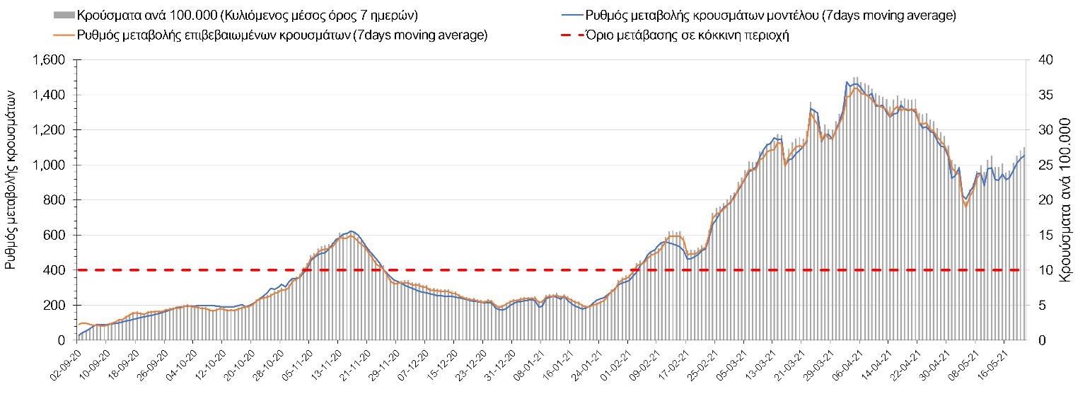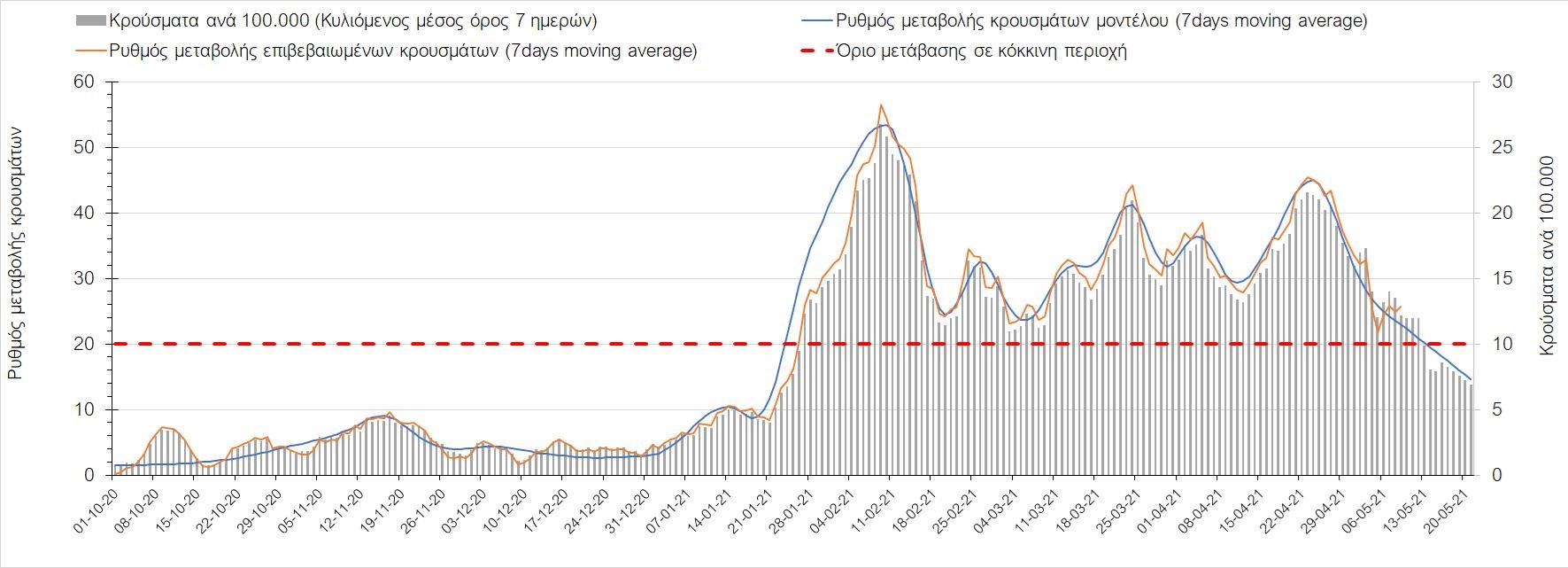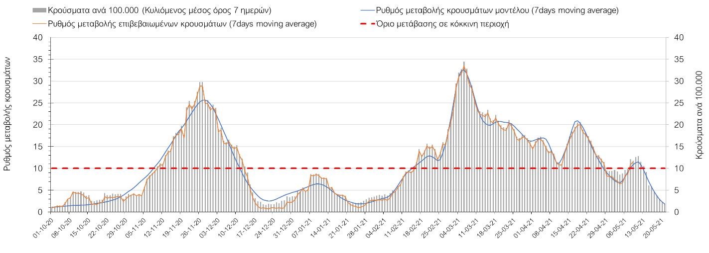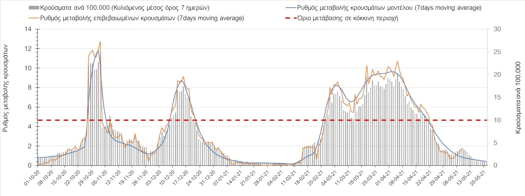 Η πορεία της μέσης εβδομαδιαίας τιμής των κρουσμάτων, καθώς και του κυλιόμενου μέσου όρου 7 ημερών του αριθμού των κρουσμάτων ανά 100.000 πληθυσμού, όπως έχουν καταγραφεί από τον ΕΟΔΥ και η αναμενόμενη πορεία τους όπως προδιαγράφεται από την υπολογιστική πλατφόρμα CORE για την Ελληνική επικράτεια μέχρι τις 15 Μαΐου, αποτυπώνονται στο Σχήμα 4. Με βάση το συνδυασμένο άνοιγμα της εστίασης στις 2 Μαΐου, και των προβλεπόμενων βαθμίδων εκπαίδευσης (Δημοτικά και Γυμνάσια) στις 10 Μαΐου, αναμένουμε την επιβράδυνση της πορεία αποκλιμάκωσης, με σημαντική πιθανότητα να υπάρξει και ένα μικρό ανοδικό κύμα το τελευταίο δεκαήμερο του Μαΐου.
