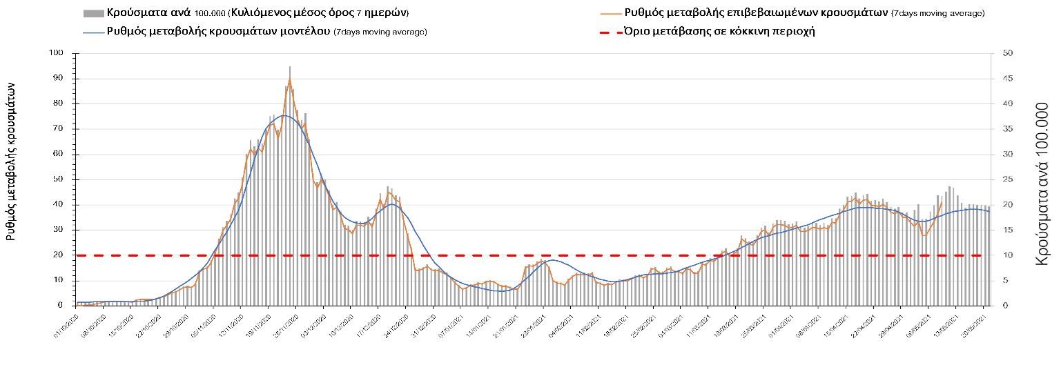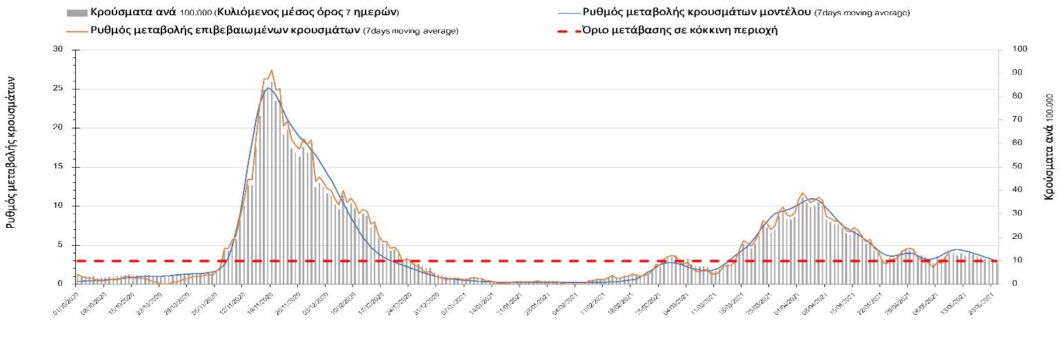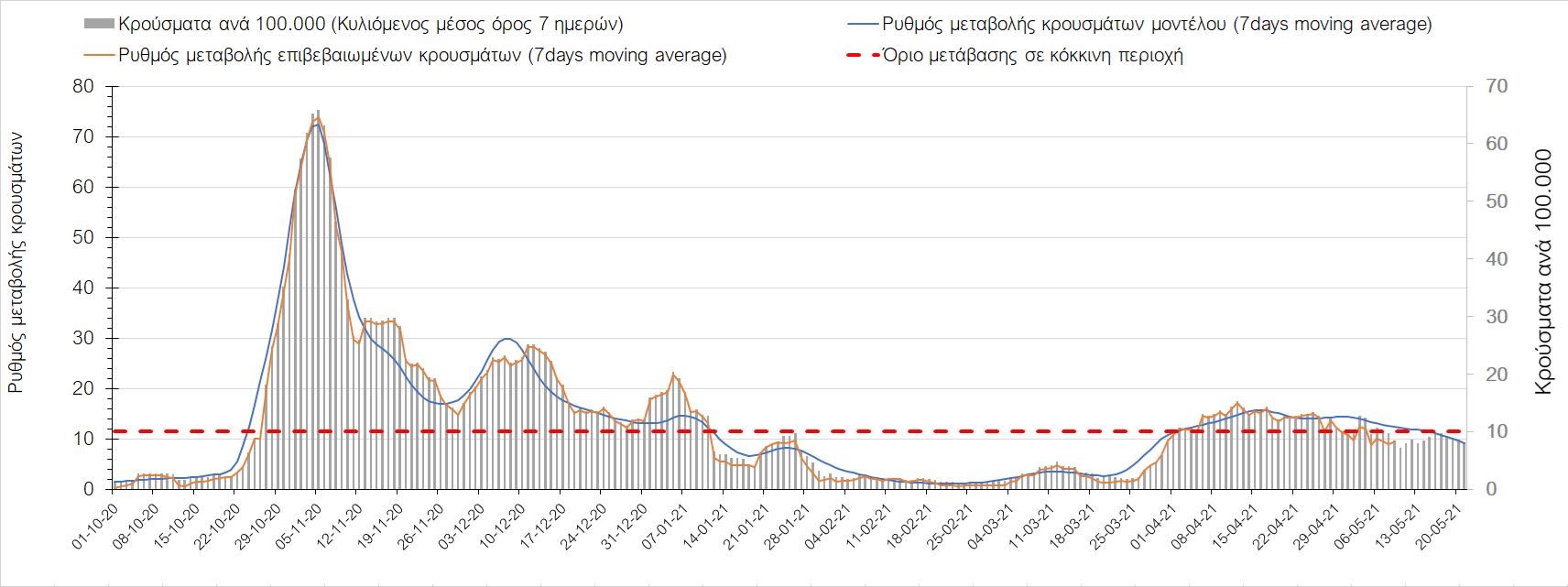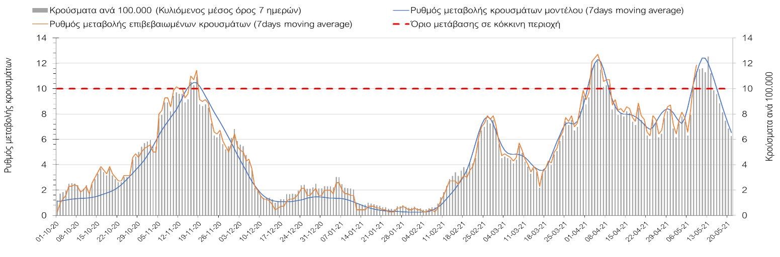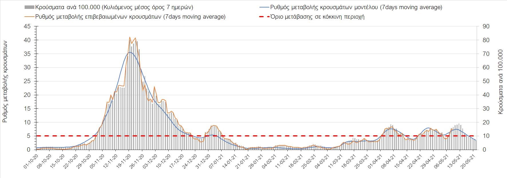 Η πορεία της μέσης εβδομαδιαίας τιμής των κρουσμάτων, καθώς και του κυλιόμενου μέσου όρου 7 ημερών του αριθμού των κρουσμάτων ανά 100.000 πληθυσμού, όπως έχουν καταγραφεί από τον ΕΟΔΥ και η αναμενόμενη πορεία τους όπως προδιαγράφεται από την υπολογιστική πλατφόρμα CORE για την Ελληνική επικράτεια μέχρι τις 15 Μαΐου, αποτυπώνονται στο Σχήμα 4. Με βάση το συνδυασμένο άνοιγμα της εστίασης στις 2 Μαΐου, και των προβλεπόμενων βαθμίδων εκπαίδευσης (Δημοτικά και Γυμνάσια) στις 10 Μαΐου, αναμένουμε την επιβράδυνση της πορεία αποκλιμάκωσης, με σημαντική πιθανότητα να υπάρξει και ένα μικρό ανοδικό κύμα το τελευταίο δεκαήμερο του Μαΐου.