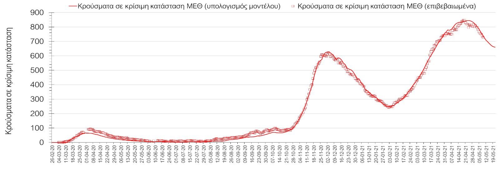 Όσον αφορά στους ασθενείς σε κρίσιμη κατάσταση (διασωληνωμένοι σε ΜΕΘ), ο αριθμός τους μειώθηκε σε σχέση με το Σάββατο (728 από 737). Παρά τις παρατηρούμενες διακυμάνσεις, διαφαίνεται να έχει ξεκινήσει η αποκλιμάκωση με βάση την επικαιροποιημένη πρόβλεψη (αυτό βέβαια με την παραδοχή ότι θα συνεχίσουν να τηρούνται τα ισχύοντα μέτρα, συμπεριλαμβανομένων των προβλεπόμενων self-test και ανοίγματα δραστηριοτήτων υψηλού συγχρωτισμού, όπως τα mall και η εστίαση θα γίνουν με την κατάλληλη προετοιμασία), η οποία όμως είναι αργή και έχει διακυμάνσεις. Αξίζει να σημειωθεί ότι ο αριθμός των ασθενών σε κρίσιμη κατάσταση όπως και των θανάτων είναι αναλογικά χαμηλότερος σε σχέση με τα αντίστοιχα μεγέθη στο δεύτερο κύμα, τόσο λόγω των εμβολιασμών ευπαθών ομάδων, όσο και του υψηλότερου αριθμού τεστ ανίχνευσης, που συντελεί στον εντοπισμό περισσότερων ασυμπτωματικών ή ήπια συμπτωματικών κρουσμάτων. Επίσης, η διασπορά των μεταλλαγμένων στελεχών που έχουν μεγαλύτερη μεταδοτικότητα από το στέλεχος του SARS-CoV-2 που κυριαρχούσε μέχρι το τέλος Φεβρουαρίου και η αυξημένη κινητικότητα του πληθυσμού έχουν μεγαλώσει το ποσοστό των νεότερων ηλικιών που μολύνονται με αποτέλεσμα η μέση ηλικία των μολύνσεων να έχει πέσει σημαντικά. Η καμπύλη εξέλιξης του αριθμού των ασθενών που νοσηλεύονται σε κλίνες ΜΕΘ με βάση τις προσομοιώσεις της πλατφόρμας CORE, όπως αυτή παρουσιάζεται στο Σχήμα 1, των ασθενών που νοσηλεύονται σε απλές κλίνες στο Σχήμα 2, ενώ μια εκτίμηση για την πορεία των θανάτων ανά ημέρα παρουσιάζεται στο Σχήμα 3.