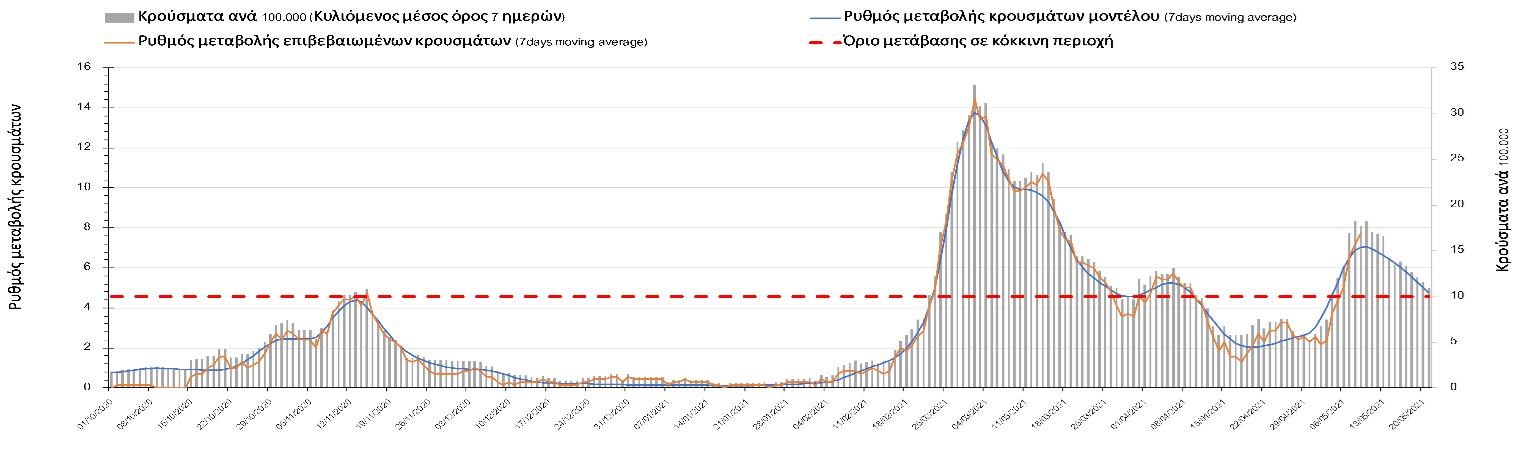 Στην Αιτωλοακαρνανία (Σχήμα 20) με 82 κρούσματα παρατηρείται μείωση σε σχέση με το Σάββατο (108 κρούσματα) (Σχήμα 20), και ενώ έχει ήδη περάσει τρεις κορυφώσεις της επιδημικής καμπύλης, η περιοχή διανύει μια τέταρτη, η οποία διατηρεί την Αιτωλοακαρνανία πάνω από το όριο της κόκκινης περιοχής. Με βάση τα τωρινά αποτελέσματα, η Αιτωλοακαρνανία είναι η περιφέρεια με την πιο έντονα ανοδική τάση, παρόλα αυτά, αναμένεται να ξεκινήσει αποκλιμάκωση στις επόμενες 2-3 ημέρες. Όπως έχουμε εκφράσει και παλιότερα, σε όλες τις επαρχιακές περιφερειακές ενότητες παρατηρούνται διακυμάνσεις οι οποίες ενίοτε αντιστρέφουν γρήγορα την καθοδική πορεία και δυστυχώς οι φόβοι που είχαμε εκφράσει παρατηρώντας και προηγούμενες κυμάνσεις, επιβεβαιώθηκαν ξανά, και η περιοχή την διανύει ένα επιπλέον ανοδικό κύμα (συγκεκριμένα το 4ο μέσα στο 2021), το οποίο μάλιστα είναι και το υψηλότερο από όλα. Επειδή αυτές οι διακυμάνσεις παρατηρούνται περισσότερο σε περιοχές της επαρχίας, παρά στα 2 μεγάλα αστικά κέντρα, θα ήταν χρήσιμο να ανακοινώνονται (ή τουλάχιστον να κοινοποιούνται στην ερευνητική ομάδα HERACLES) τα στοιχεία του ημερήσιου αριθμού των τεστ τα οποία διενεργούνται από τον ΕΟΔΥ ανά περιοχή, έτσι ώστε να μπορούμε να διαπιστώνουμε νωρίς εάν αυτές οι διακυμάνσεις οφείλονται σε γεγονότα υπερμετάδοσης (που σχετίζονται με δραστηριότητες που δε συνάδουν με την τήρηση των μέτρων) ή με τη διακύμανση του αριθμού των τεστ ανίχνευσης σε ημερήσια βάση. Στη συγκεκριμένη περίπτωση, οι διακυμάνσεις δεν μπορούν να εξηγηθούν ούτε από τα ισχύοντα μέτρα, ούτε από τη βελτίωση του καιρού, παρά μόνο από φαινόμενα αδικαιολόγητης συρροής, γι’ αυτό και είναι αναγκαίες, τόσο η αύξηση της επιδημιολογικής επιτήρησης, όσο και ο έλεγχος συμμόρφωσης με τα μέτρα αναχαίτισης της επιδημίας.