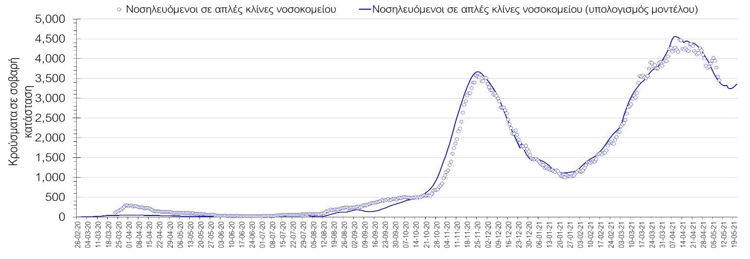 Με βάση την επικαιροποιημένη πρόβλεψη που πραγματοποιήσαμε, σύμφωνα με τον αριθμό των κρουσμάτων που παρατηρείται αυτές τις ημέρες, το ύψος του ανοδικού κύματος υπολογίζεται να επαναφέρει τον ημερήσιο αριθμό των κρουσμάτων ίσως και λίγο πάνω από τα 2500 πριν την αποκλιμάκωση του. Αυτό θα εξαρτηθεί από το βαθμό συμμόρφωσης στα μέτρα περιορισμού της πανδημίας. Πρέπει επίσης να σημειωθεί, ότι με βάση την επικαιροποιημένη ανάλυση των δεδομένων διασποράς της πανδημίας στη χώρα, παρατηρήθηκε αύξηση των ενεργών επαφών τις τελευταίες ημέρες του Απριλίου. Αυτές μπορούν να οφείλονται στο άνοιγμα των μεγάλων εμπορικών κέντρων (να σημειωθεί ότι έγινε χωρίς την εγκατάσταση συσκευών απολύμανσης του αέρα αν και πρόκειται για εσωτερικούς χώρους με ανάγκη τεχνητού εξαερισμού) και στην κίνηση της αγοράς λόγω του Πάσχα, αλλά και στις αυξημένες κοινωνικές επαφές κατά τη διάρκεια των εορτών του Πάσχα. Αυτή η προβλεπόμενη πορεία, που αφορά τα κρούσματα, τους νοσηλευόμενους σε απλές κλίνες, όσο και σε ΜΕΘ, καθώς επίσης και τους θανάτους, βασίζεται στις ακόλουθες παραδοχές: