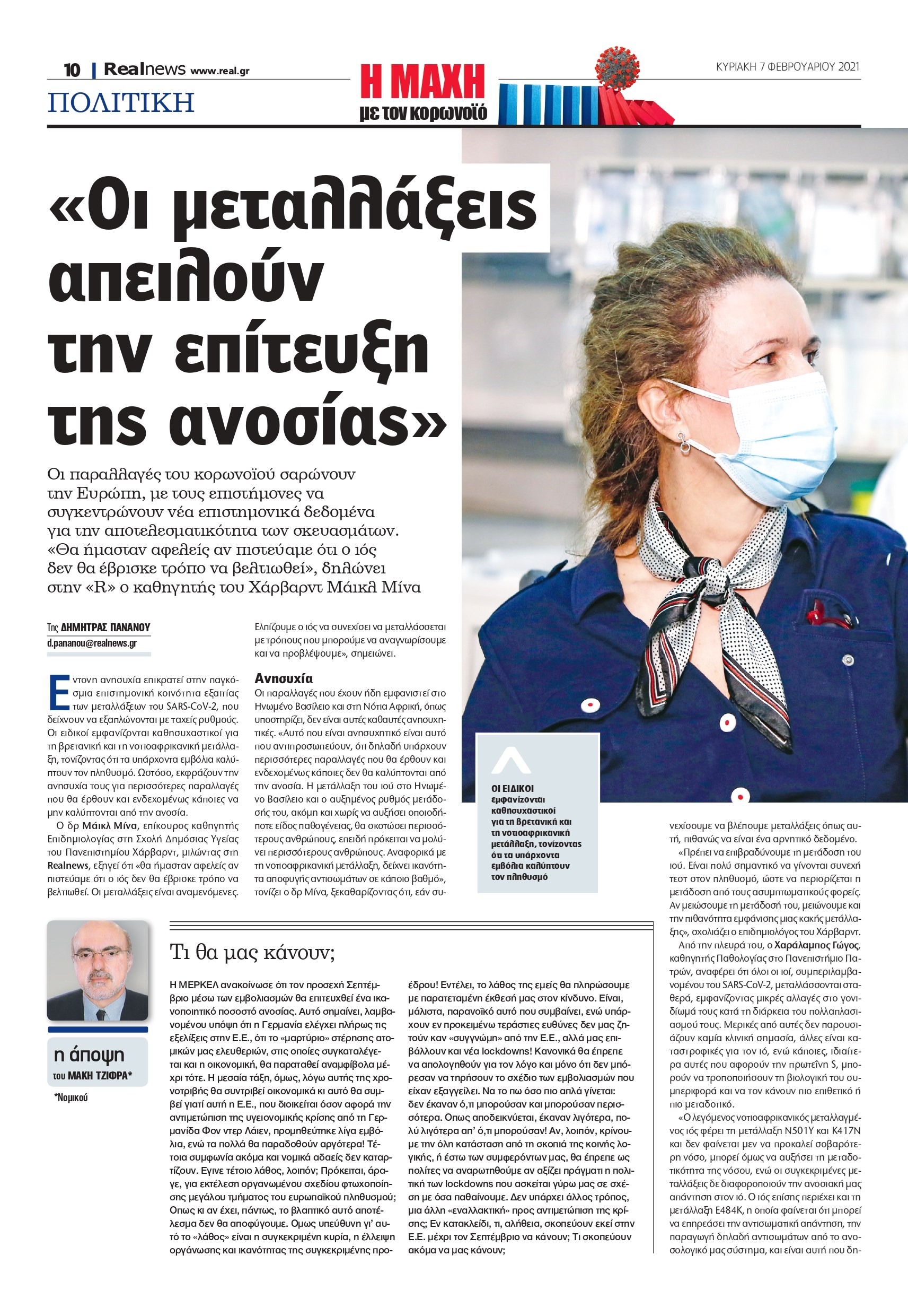 Ο δρ Μάικλ Μίνα, επίκουρος καθηγητής Επιδημιολογίας στη Σχολή Δημόσιας Υγείας του Πανεπιστημίου Χάρβαρντ, μιλώντας στη Realnews, εξηγεί ότι “θα ήμασταν αφελείς αν πιστεύαμε ότι ο ιός δεν θα έβρισκε τρόπο να βελτιωθεί. Οι μεταλλάξεις είναι αναμενόμενες. Ελπίζουμε ο ιός να συνεχίσει να μεταλλάσσεται με τρόπους που μπορούμε να αναγνωρίσουμε και να προβλέψουμε”, σημειώνει.