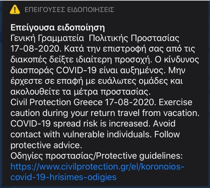 Η αποστολή του μηνύματος από το 112 αναφέρει: «Γενική Γραμματεία Πολιτικής Προστασίας 17-08-2020. Κατά την επιστροφή σας από τις διακοπές δείξτε ιδιαίτερη προσοχή. Ο κίνδυνος διασποράς COVID-19 είναι αυξημένος, Μην έρχεστε σε επαφή με ευάλωτες ομάδες και ακολουθείτε τα μέτρα προστασίας».