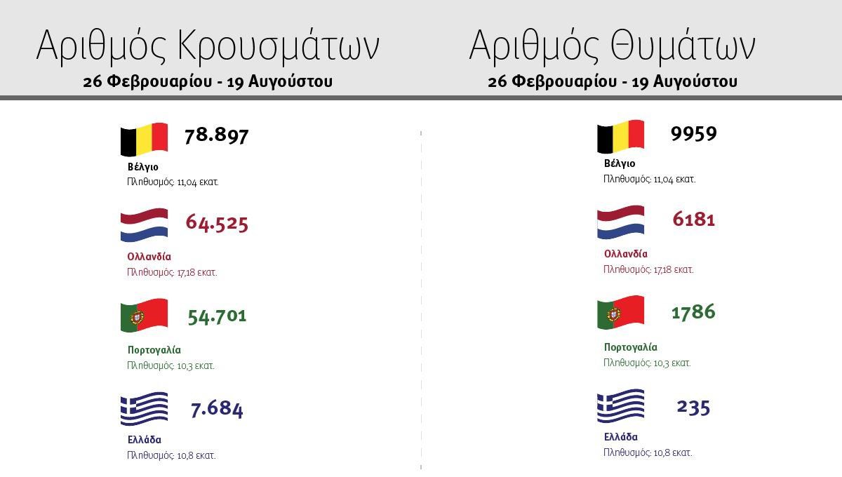 «Οι θάνατοι που αποτελούν τον πιο σκληρό, τον πιο θλιβερό, αλλά και τον πιο αδιάψευστο δείκτη για το κόστος που πληρώνει κάθε χώρα από την πανδημία ανέρχονται σε 770.273 παγκοσμίως, σε 179.660 στην Ε.Ε. και σε 235 στην Ελλάδα. Προκύπτει έτσι ότι σε παγκόσμιο επίπεδο, ο μέσος όρος κρουσμάτων είναι 2.831 ανά ένα εκατομμύριο κατοίκους. Αντίστοιχα, στην Ελλάδα ανέρχονται σε 693 ανά ένα εκατομμύριο κατοίκους. Και ενώ ο μέσος όρος θανάτων παγκοσμίως είναι 100 ανά ένα εκατομμύριο κατοίκους, στην Ελλάδα είναι 22, δηλαδή πέντε φορές περίπου μικρότερος. Έτσι, η χώρα μας κατατάσσεται στην 132η θέση ως προς τα κρούσματα του κορονοϊού και στην 108η θέση ως προς τους θανάτους ανά εκατομμύριο κατοίκους” ανέφερε ο κυβερνητικός εκπρόσωπος. Παρουσίασε γραφήματα σύμφωνα με τα οποία αποδεικνύεται “η καλύτερη επιδημιολογική εικόνα στην Ελλάδα έναντι άλλων χωρών” και “απαντά σε όλους εκείνους που προσπαθούν να καλλιεργήσουν την εικόνα ότι «το πράγμα ξεφεύγει στη χώρα μας».