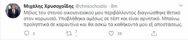 Χαρακτηριστικά ο Μιχάλης Χρυσοχοΐδης έγραψε: “Μέλος του στενού οικογενειακού μου περιβάλλοντος διαγνώσθηκε θετικό στον κορωνοϊό. Υποβλήθηκα αμέσως σε τέστ και είναι αρνητικό. Μπαίνω προληπτικά σε καραντίνα και θα ασκώ τα καθήκοντά μου εξ αποστάσεως”.