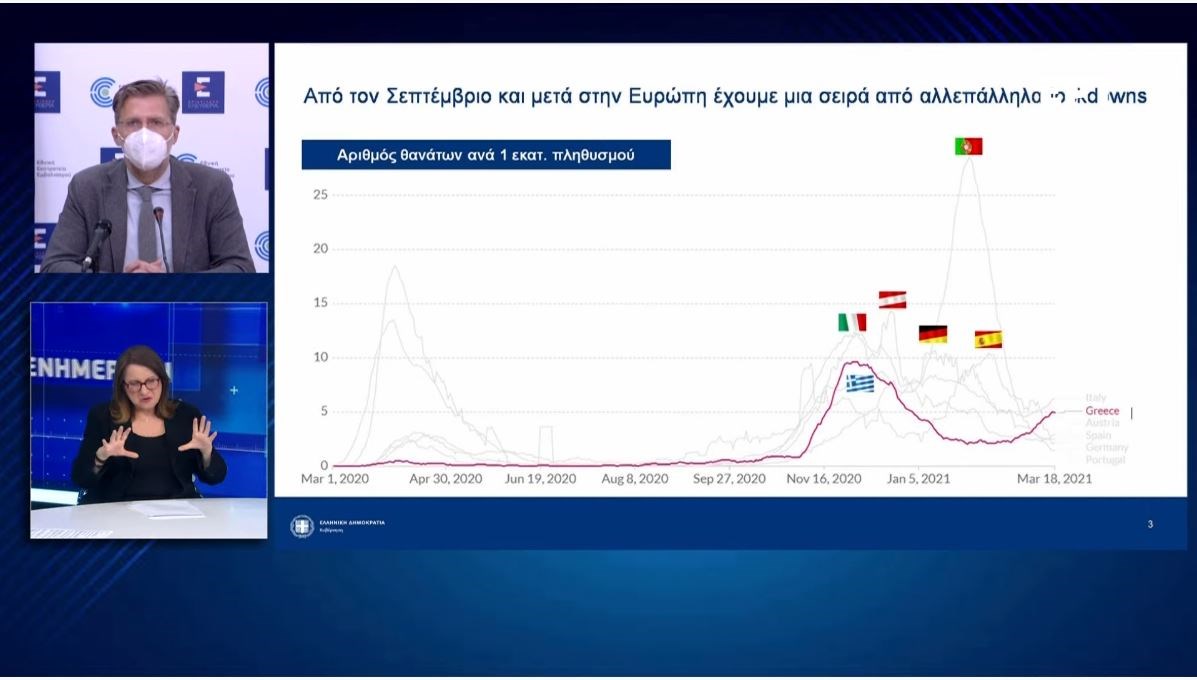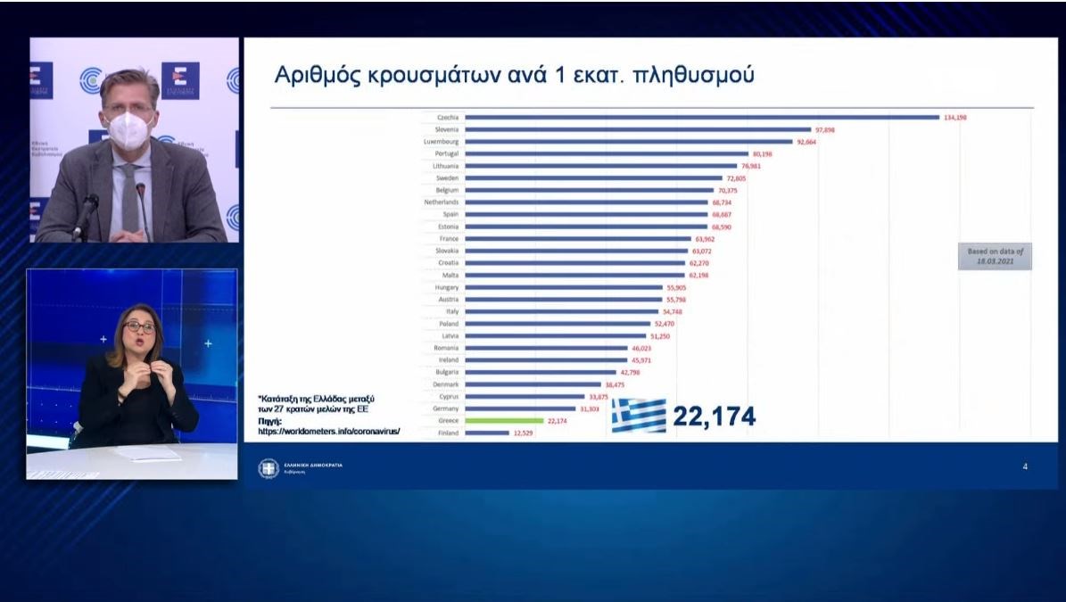Έκανε λόγο για συστράτευση κράτους και πολιτών μέσα από την εμπιστοσύνη και την αλήθεια «για να φτάσουμε με ασφάλεια στο τέλος της περιπέτειας». Όπως τόνισε στη συνέχεια, στην Ελλάδα τα έχουμε πάει καλύτερα από πολλές άλλες χώρες στην ΕΕ, οι οποίες έχουν πληγεί από τρία ή και τέσσερα κύματα. Είμαστε 26οι στους 27 σε κρούσματα Covid και 23οι σε θανάτους, πρόσθεσε. Και ειδικά για τους θανάτους ο κ. Σκέρτσος επισήμανε: «Δυστυχώς οι θάνατοι από covid είναι δυστυχώς ο πιο σκληρός, αλλά και ο πιο αδιάψευστος δείκτης για τη διαχείριση αυτή της πανδημίας. Είναι μία μακάβρια στατιστική που δείχνει, όμως, ξεκάθαρα τη στόχευση της στρατηγικής μας. Να σώσουμε όσες περισσότερες ζωές γίνονται σε έναν ασύμμετρο πόλεμο. Δουλεύουν, στερούν την ελευθερία μας, αλλά φέρνουν αποτέλεσμα».