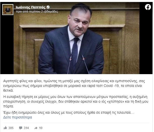 Να σημειωθεί πως ο κ. Μαρκόπουλος είναι ο 3ος βουλευτής της ΝΔ που νοσεί από κορονοϊό τις τελευταίες μέρες. Στις 25 Φεβρουαρίου ο βουλευτής Ν. Δωδεκανήσου με τη ΝΔ, Ιωάννης Παππάς είχε ανακοινώσει με ανάρτησή του στο Facebook ότι είναι θετικός στον ιό. “Αγαπητές φίλες και φίλοι, τιμώντας τη μεταξύ μας σχέση ειλικρίνειας και εμπιστοσύνης, σας ενημερώνω πώς σήμερα υποβλήθηκα σε μοριακό και rapid τεστ Covid -19, τα οποία είναι θετικά. Η ευλαβική τήρηση εκ μέρους μου όλων των απαιτούμενων μέτρων προστασίας, η αυξημένη επαγρύπνηση, οι συνεχείς έλεγχοι, δεν στάθηκαν αρκετοί και ο ιός «χτύπησε» και τη δική μου πόρτα. Έχω ήδη ενημερώσει όλες και όλους με τους οποίους ήρθα σε επαφή τις τελευταίες ημέρες και με την καθοδήγηση των ιατρών θα παραμείνω σε καραντίνα το χρονικό διάστημα που προβλέπεται από τα υγειονομικά πρωτόκολλα. Αγαπητές φίλες και φίλοι, εφιστώ την προσοχή σας: όχι στη χαλάρωση, όχι στον εφησυχασμό, πιστή τήρηση των υγειονομικών πρωτοκόλλων γιατί ο αόρατος εχθρός είναι ακόμα ανάμεσα μας”, ανέφερε χαρακτηριστικά.