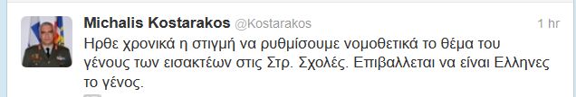 Ήρθε χρονικά η στιγμή να ρυθμίσουμε νομοθετικά το θέμα των εισακτέων στις στρατιωτικές σχολές, twittάρει ο αρχηγός ΓΕΕΘΑ Μιχάλης Κωσταράκος.