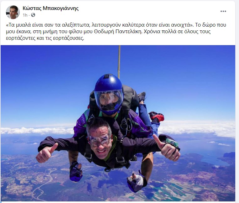 “«Τα μυαλά είναι σαν τα αλεξίπτωτα, λειτουργούν καλύτερα όταν είναι ανοιχτά». Το δώρο που μου έκανα, στη μνήμη του φίλου μου Θοδωρή Παντελάκη. Χρόνια πολλά σε όλους τους εορτάζοντες και τις εορτάζουσες” έγραψε ο δήμαρχος Αθηναίων σε ανάρτησή του στο Facebook.