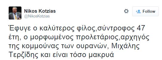 Τον σύντροφό του από το ΚΚΕ, Μιχάλη Τερζίδη, “αποχαιρέτησε” μέσα από το twitter ο Νίκος Κοτζιάς.
