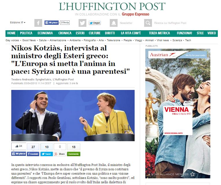Στην επικείμενη επίσκεψη του Αλέξη Τσίπρα στη Ρωσία, τις επαφές της ελληνικής κυβέρνησης με Πεκίνο και Μόσχα, τη διαπραγμάτευση με τους εταίρους, αλλά και τις ελληνογερμανικές σχέσεις, αναφέρθηκε, μεταξύ άλλων, ο υπουργός Εξωτερικών Νίκος Κοτζιάς, σε μια συνέντευξη, «εφ΄όλης της ύλης», με τίτλο «Η Ευρώπη ας το καταλάβει: Ο ΣΥΡΙΖΑ δεν είναι παρένθεση», στην ιστοσελίδα Huffington Post Italia.