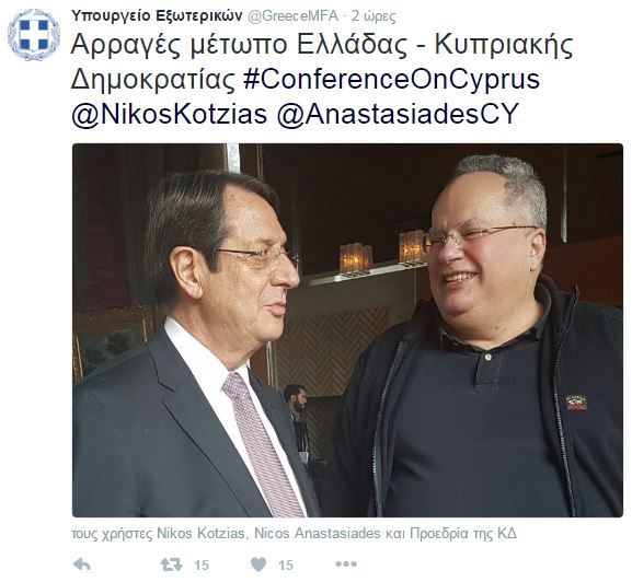 Την ίδια στιγμή, το ελληνικό υπουργείο Εξωτερικών δημοσίευσε στο twitter μία φωτογραφία του Νίκου Κοτζιά με τον πρόεδρο της Κυπριακής Δημοκρατίας: «Αρραγές μέτωπο Ελλάδας – Κυπριακής Δημοκρατίας».