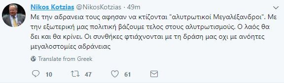 «Με την αδράνεια τους άφησαν να κτίζονται “αλυτρωτικοί Μεγαλέξανδροι”. Με την εξωτερική μας πολιτική βάζουμε τέλος στους αλυτρωτισμούς. Ο λαός θα δει και θα κρίνει. Οι συνθήκες φτιάχνονται με τη δράση μας όχι με ανόητες μεγαλοστομίες αδράνειας».
