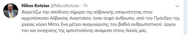 “Χαιρετίζω” γράφει ο Ν. Κοτζιάς “την απόδοση σήμερα της αλβανικής υπηκοότητας στον αρχιεπίσκοπο Αλβανίας Αναστάσιο, έναν σοφό άνθρωπο, από τον Πρόεδρο της χώρας κύριο Μέτα. Ένα μέτρο αναγνώρισης του βαθιά ανθρωπιστικού έργου του και ενίσχυσης της εμπιστοσύνης ανάμεσα στους λαούς μας”.