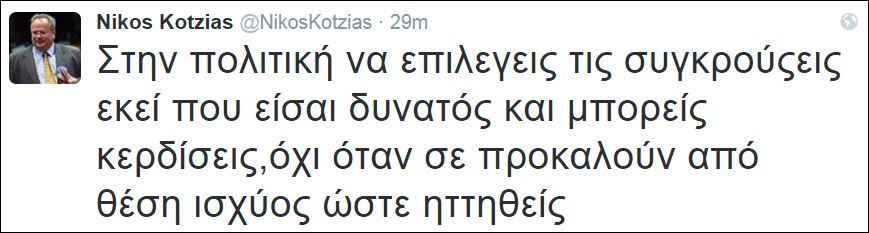 «Στην πολιτική να επιλέγεις τις συγκρούσεις εκεί που είσαι δυνατός και μπορείς  να κερδίσεις, όχι όταν σε προκαλούν από θέση ισχύος ώστε να ηττηθείς», έγραψε ο κ. Κοτζιάς.
