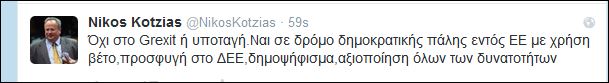 Την αντίθεσή του στο Grexit ή στην υποταγή εξέφρασε μέσω Twitter ο υπουργός Εξωτερικών Νίκος Κοτζιάς, ο οποίος έκανε λόγο για «δημοκρατική πάλη εντός ΕΕ με χρήση βέτο».