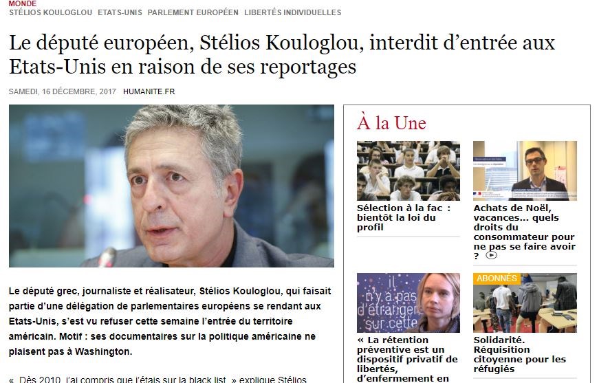 «Καθ΄ όλη αυτή την περίοδο, η αμερικανική πρεσβεία στην Αθήνα διαμαρτυρόταν στην ελληνική κυβέρνηση, «που παρενέβη στο διοικητικό συμβούλιο της ΕΡΤ, για να αναφέρει ότι τα ρεπορτάζ του Στέλιου Κούλογλου προκαλούσαν δυσκολίες στις διαπραγματεύσεις του τότε πρωθυπουργού, Κώστα Σημίτη, με τις ΗΠΑ. Το 2008, η κατάσταση κλιμακώθηκε σε ένα διοικητικό συμβούλιο της δημόσιας τηλεόρασης. «Ένα μήνα μετά, απολύθηκα», λέει ο ευρωβουλευτής» γράφει η «Humanite» και εξηγεί:«Έπρεπε να περιμένει πολλά χρόνια για να μάθει τους πραγματικούς λόγους της απόλυσής του, όμως από το 2010 και έπειτα κάθε αίτησή του για βίζα ώστε να ταξιδέψει στις ΗΠΑ απορριπτόταν. Τα πολυάριθμα διαβήματα οργανώσεων, όπως οι «Ρεπόρτερ Χωρίς Σύνορα» δεν έφεραν αποτέλεσμα. Στον Έλληνα δημοσιογράφο αρνούνταν ακόμη και τουριστική βίζα. “Ήλπιζα ότι η εκλογή μου στο Ευρωκοινοβούλιο θα άλλαζε την κατάσταση” προσθέτει ο ίδιος. Όμως δεν έγινε κάτι τέτοιο». Τον Ιούλιο, καλεσμένος ως ευρωβουλευτής να συμμετάσχει στο People’s Summit του Σικάγο, ο Στέλιος Κούλογλου κατέθεσε νέο αίτημα για βίζα, αλλά η αμερικανική πρεσβεία, για ακόμη μια φορά, δεν έδωσε απάντηση. Πριν από λίγες μόνο μέρες, επρόκειτο να ταξιδέψει επισήμως ως μέλος της αντιπροσωπείας του Ευρωπαϊκού Κοινοβουλίου, που θα είχε συναντήσεις με Αμερικανούς αξιωματούχους. Όμως και πάλι του απαγορεύθηκε η είσοδος σε αμερικανικό έδαφος.«Καλούμενη να δώσει εξηγήσεις, αυτή τη φορά κατόπιν αιτήσεων από τους ευρωπαϊκούς οργανισμούς, η αμερικανική κυβέρνηση, μόλις την προηγούμενη Δευτέρα, πληροφόρησε τον ευρωβουλευτή, αλλά και το Ευρωπαϊκό Κοινοβούλιο, για τους λόγους: “τρομοκρατία”», γράφει η Humanite.«Έμαθα λοιπόν εν τέλει, ότι είμαι ύποπτος για αεροπειρατεία και ότι υποστηρίζω τρομοκρατικές οργανώσεις!» εξηγεί ο Στέλιος Κούλογλου, αρνούμενος, χαμογελώντας, τους τρελούς ισχυρισμούς της αμερικανικής κυβέρνησης, όπως αναφέρει η γαλλική εφημερίδα.