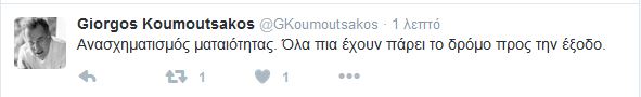 «Ανασχηματισμός ματαιότητας. Όλα πια έχουν πάρει το δρόμο τους. Προς την έξοδο» ανέφερε ο εκπρόσωπος Τύπου της Νέας Δημοκρατίας, Γιώργος Κουμουτσάκος στο Twitter, αναφερόμενος στις πολιτικές εξελίξεις.