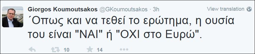 Στην πρώτη ανάρτηση, ο βουλευτής της Νέας Δημοκρατίας γράφει «Η απόφαση είναι στην πραγματικότητα απονενοημένη απόπειρα αποποίησης ευθυνών» και στη δεύτερη συνεχίζει υποστηρίζοντας «Όπως και να τεθεί το ερώτημα, η ουσία του είναι ”ΝΑΙ” ή ”ΟΧΙ στο Ευρώ”».