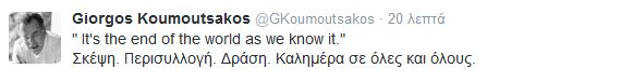 Στο μήνυμά του ο κ. Κουμουτσάκος έγραψε: «It’s the end of the world as we know it. Σκέψη. Περισυλλογή. Δράση. Καλημέρα σε όλες και όλους».