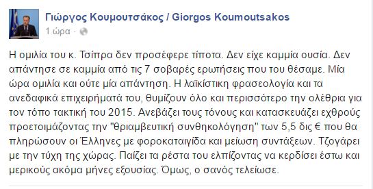 «Η ομιλία του κ. Τσίπρα δεν προσέφερε τίποτα. Δεν είχε καμία ουσία. Δεν απάντησε σε καμία από τις 7 σοβαρές ερωτήσεις που του θέσαμε. Μία ώρα ομιλία και ούτε μία απάντηση» έγραψε ο εκπρόσωπος Τύπου της ΝΔ, Γιώργος Κουμουτσάκος, στο λογαριασμό του στο facebook.