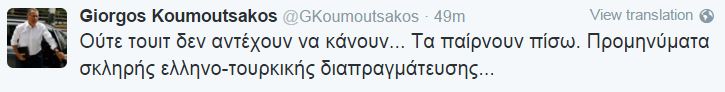 «Ούτε τουιτ δεν αντέχουν να κάνουν… Τα παίρνουν πίσω. Προμηνύματα σκληρής ελληνο-τουρκικής διαπραγμάτευσης…» έγραψε ο κ. Κουμουτσάκος.