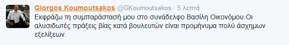 Την συμπαράστασή του στον βουλευτή Βασίλη Οικονόμου εξέφρασε, μέσω Twitter, ο βουλευτής της ΝΔ Γιώργος Κουμουτσάκος.