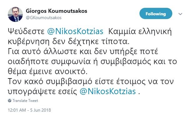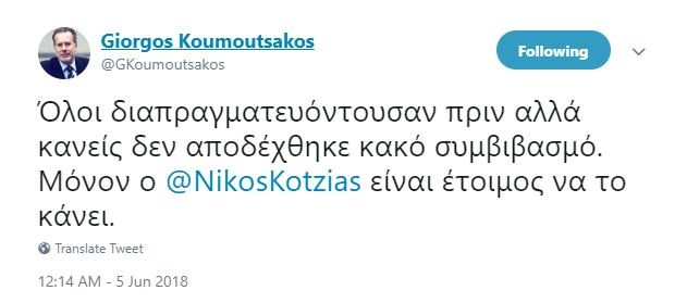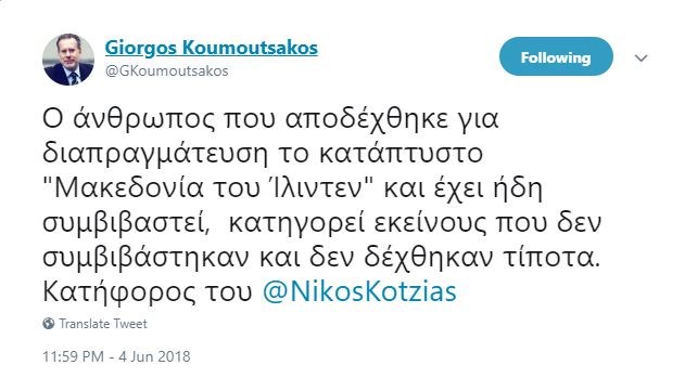 “Ο άνθρωπος που αποδέχθηκε για διαπραγμάτευση το κατάπτυστο ‘Μακεδονία του Ίλιντεν’ και έχει ήδη συμβιβαστεί, κατηγορεί εκείνους που δεν συμβιβάστηκαν και δεν δέχθηκαν τίποτα. Κατήφορος του Νίκου Κοτζιά” έγραψε ο κ. Κουμουτσάκος σε ανάρτηση στον προσωπικό του λογαριασμό στο Twitter και σημείωσε: “Όλοι διαπραγματευόντουσαν πριν αλλά κανείς δεν αποδέχθηκε κακό συμβιβασμό. Μόνον ο Νίκος Κοτζιάς είναι έτοιμος να το κάνει”.