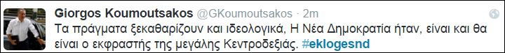 «Τα πράγματα ξεκαθαρίζουν και ιδεολογικά, η Νέα Δημοκρατία ήταν, είναι και θα είναι ο εκφραστής της μεγάλης Κεντροδεξιάς» έγραψε ο κ. Κουμουτσάκος.