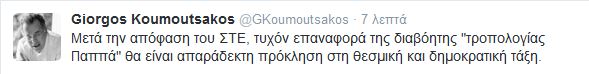 Ο κ.Κουμουτσάκος έγραψε στο Twitter: «Μετά την απόφαση του ΣτΕ, τυχόν επαναφορά της διαβόητης “τροπολογίας Παππά” θα είναι απαράδεκτη πρόκληση στη θεσμική και δημοκρατική τάξη.