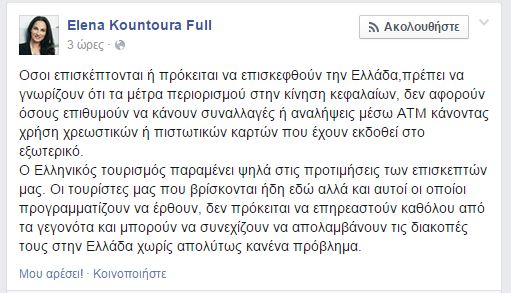 “Οι τουρίστες μας που βρίσκονται ήδη εδώ αλλά και αυτοί οι οποίοι προγραμματίζουν να έρθουν, δεν πρόκειται να επηρεαστούν καθόλου από τα γεγονότα” γράφει η υπουργός Τουρισμού Έλενα Κουντουρά στο facebook.