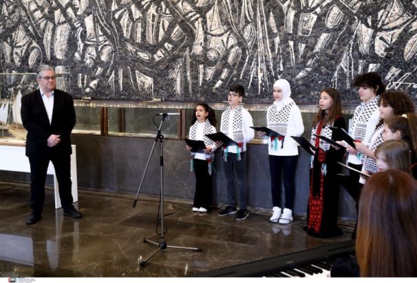 Η παιδική χορωδία της Παλαιστινιακής Παροικίας Ελλάδας έψαλλε τα Πρωτοχρονιάτικα κάλαντα στον ΓΓ της ΚΕ του ΚΚΕ Δημήτρη Κουτσούμπα, σήμερα (30/12), στην έδρα της ΚΕ στον Περισσό.
