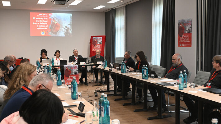 Επισήμανε ακόμη την μακροχρόνια επιχείρηση αμαύρωσης της ΕΣΣΔ και των αντάρτικων κινημάτων, με στόχο «να κρύψουν την οργανική διασύνδεση του ναζισμού-φασισμού με τον μονοπωλιακό καπιταλισμό και τις μεγάλες ευθύνες όλων των αστικών -φιλελεύθερων και σοσιαλδημοκρατικών- κομμάτων» σημειώνοντας, μεταξύ άλλων, ότι «στις πρώτες θέσεις αυτής της μεθοδευμένης βρώμικης εκστρατείας βρίσκεται η καπιταλιστική ένωση των χωρών της Ευρώπης, η αντιδραστική Ευρωπαϊκή Ένωση».