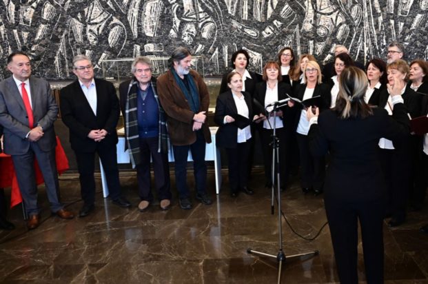 Τα πρωτοχρονιάτικα κάλαντα άκουσε ο γγ της ΚΕ του ΚΚΕ, Δημήτρης Κουτσούμπας, από τα μέλη της Πανηπειρωτικής Συνομοσπονδίας Ελλάδας, στην έδρα της ΚΕ στον Περισσό.