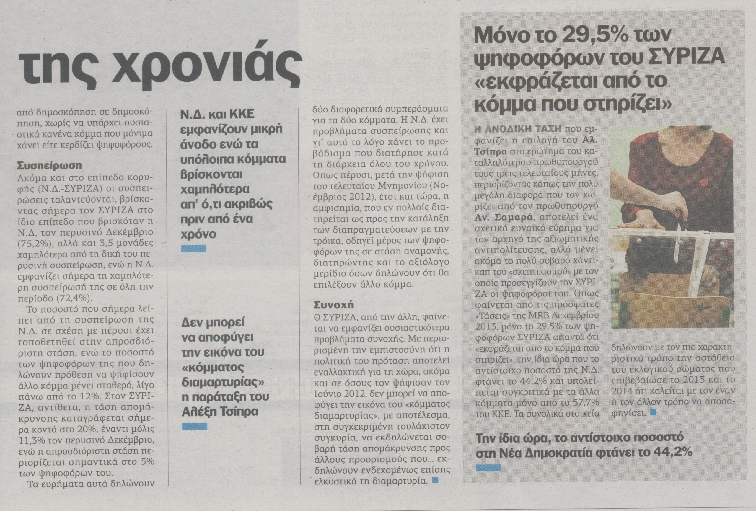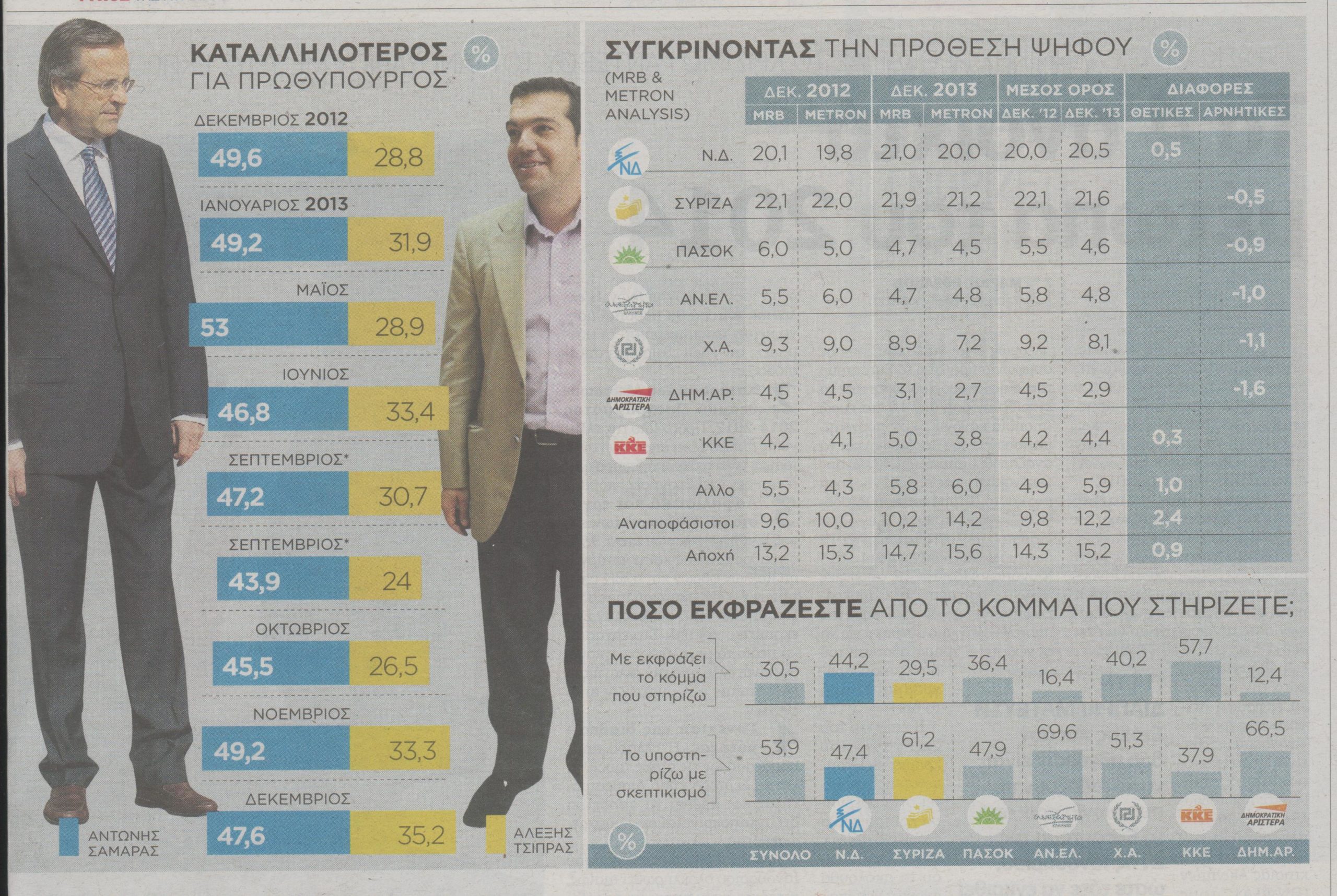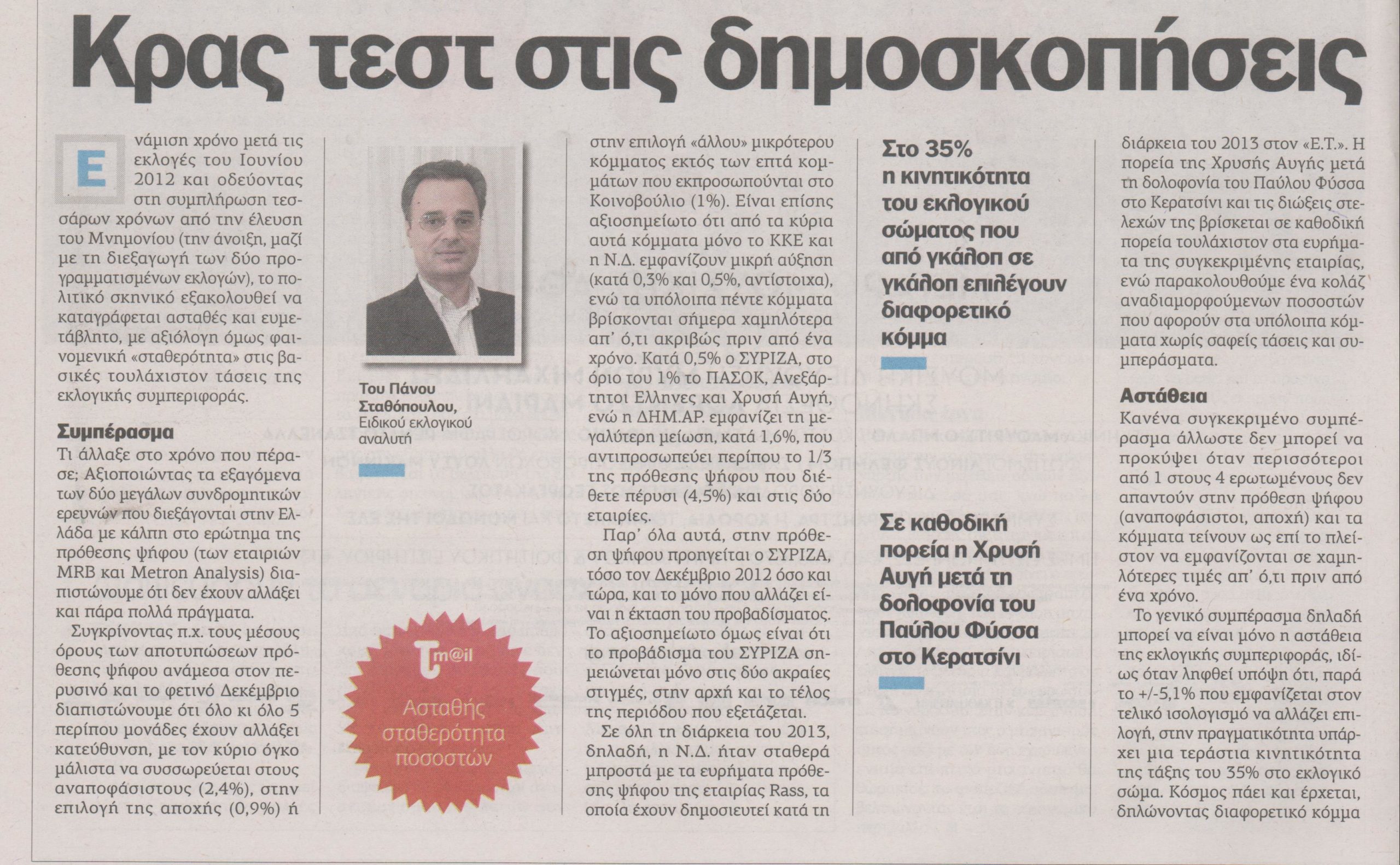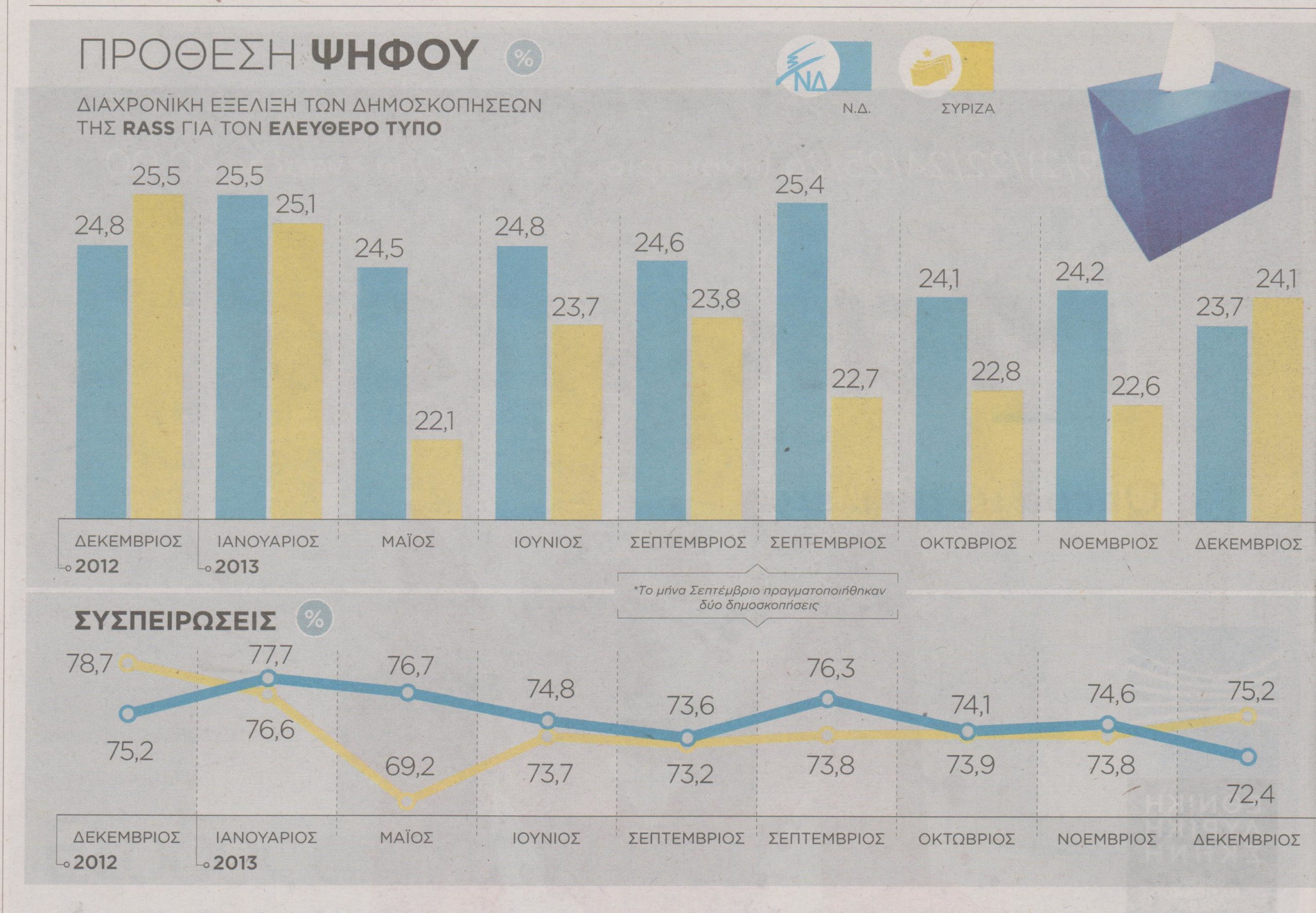 Σε όλη τη διάρκεια του 2013, δηλαδή η ΝΔ ήταν σταθερά μπροστά με τα ευρήματα πρόθεσης ψήφου της εταιρείας Rass, τα οποία έχουν δημοσιευτεί κατά τη διάρκεια του 2013 στον «Ε.Τ.». Η πορεία της Χρυσής Αυγής, μετά τη δολοφονία του Παύλου Φύσσα στο Κερατσίνι και τις διώξεις στελεχών της, βρίσκεται σε καθοδική πορεία τουλάχιστον στα ευρήματα της συγκεκριμένης εταιρείας, ενώ παρακολουθούμε ένα κολάζ αναδιαμορφούμενων ποσοστών που αφορούν στα υπόλοιπα κόμματα χωρίς σαφείς τάσεις και συμπεράσματα.