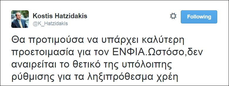 Ο Κωστής Χατζηδάκης έγραψε πριν από λίγο στο Twitter “Θα προτιμούσα να υπάρχει καλύτερη προετοιμασία για τον ΕΝΦΙΑ. Ωστόσο,δεν αναιρείται το θετικό της υπόλοιπης ρύθμισης για τα ληξιπρόθεσμα χρέη”.