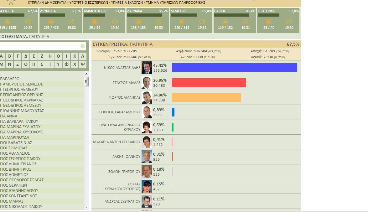 Με καταμετρημένο το 67,5% της Επικράτειας, προηγείται ο Νίκος Αναστασιάδης με 45,41% και ακολουθούν ο Σταύρος Μαλάς με 26,95% και ο Γιώργος Λιλλήκας με 24,96%.