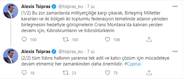 «Σε αυτούς τους δύσκολους καιρούς είναι πιο σημαντικό από ποτέ να συγκρουστούμε με τον εθνικισμό και αν συνεχίσουμε να μαχόμαστε για τη μόνη δίκαιη και βιώσιμη λύση προς όφελος του λαού της Κύπρου, Ελληνοκύπριους και Τουρκοκύπριους. Η επανεκκίνηση των διαπραγματεύσεων από εκεί όπου έμειναν στο Κραν Μοντανά, με στόχο την επανένωση του νησιού στη βάση των ψηφισμάτων του ΟΗΕ και μιας διζωνικής, δικοινοτικής ομοσπονδία», ανέφερε στο μήνυμα του ο Αλέξης Τσίπρας.